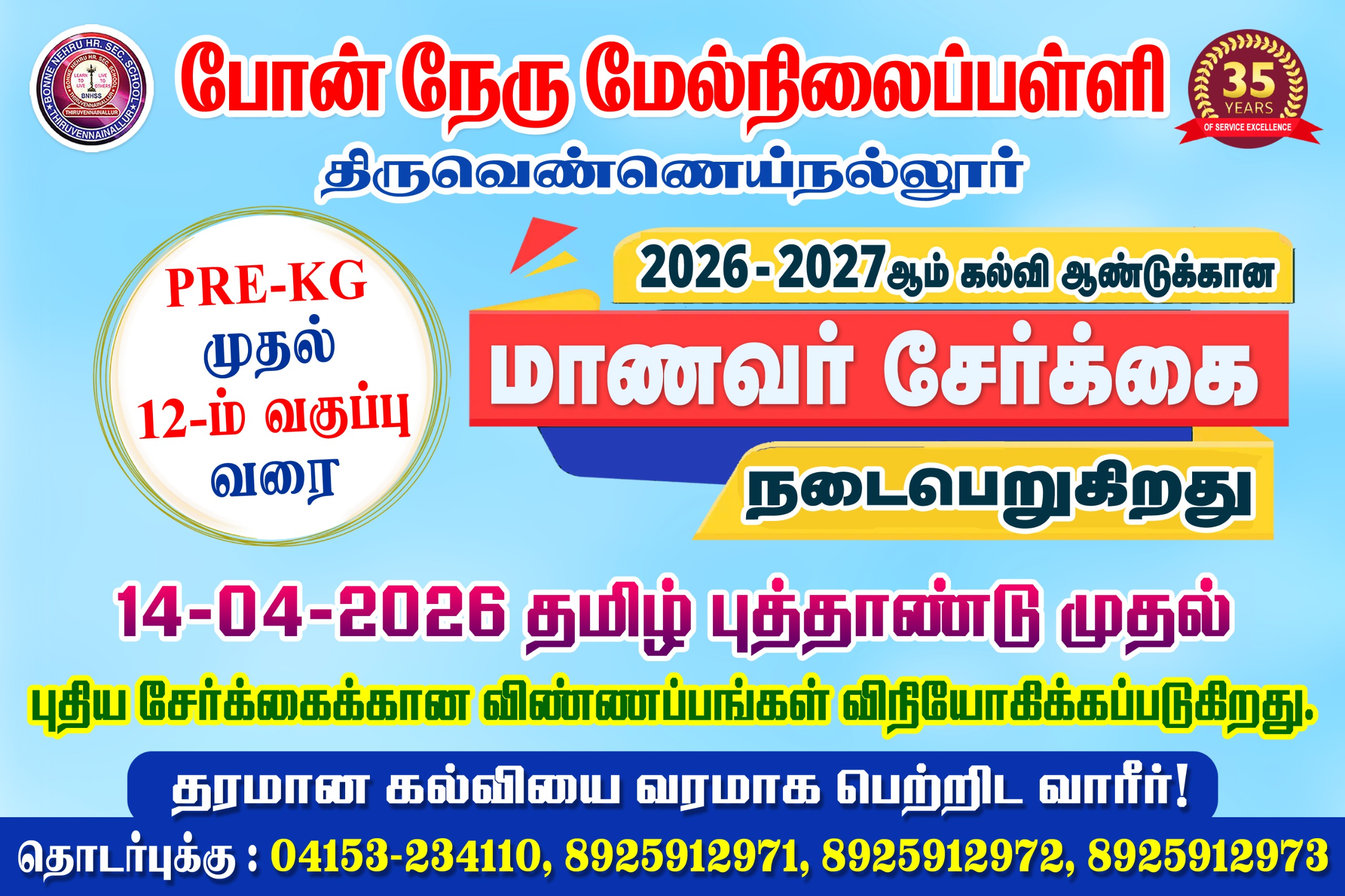 Bonne Nehru Hr. Sec. School is a co-educational school, recognized by the Government of Tamilnadu with classes Pre-K.G to XII std. The School follows Tamilnadu Samacheer kalvi syllabus.